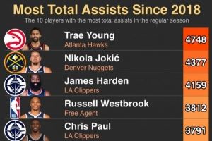 體育資訊9月27日訊 美媒HoopsHype統(tǒng)計,從2018年至今NBA助攻最多的10位球員,其中特雷-楊最多有4748次,而約基奇排名第二有4377次。