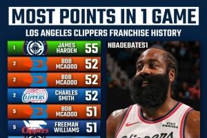 快船隊(duì)史得分榜前十!哈登55分第一 鮑勃·麥卡杜5次50+上榜5次