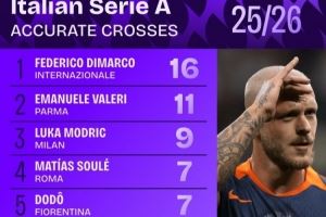 本賽季意甲迪馬爾科16次精準(zhǔn)傳中第一,莫德里奇9次排名第三