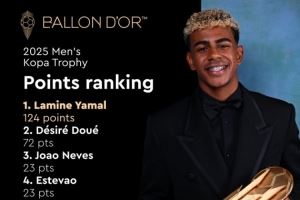 體育資訊9月27日訊 金球獎官方公布了男子科帕獎的得分細節(jié),其中亞馬爾124分成功衛(wèi)冕,以52分的優(yōu)勢領(lǐng)先于獲得72分的杜埃,科帕獎由歷屆金球獎得主投票選出?!蛾爤蟆穲蟮?,古利特是唯一未將第一順位投給亞馬爾的評委。