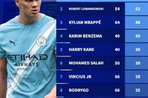 自哈蘭德首秀以來歐冠進球榜:哈蘭德50場52球居首,萊萬次席