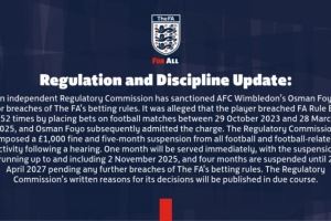 獨(dú)立監(jiān)管委員會(huì)已對(duì)AFC溫布爾登球員奧斯曼-福約違反博彩條例的行為作出處罰。據(jù)指控,該球員在2023年10月29日至2025年3月28日期間對(duì)足球比賽進(jìn)行投注,違反英足總E8條例252次。
