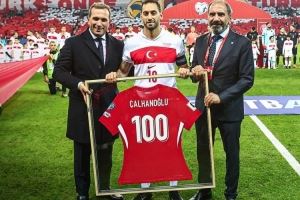 恰爾汗奧盧在對(duì)陣保加利亞的比賽中達(dá)成國家隊(duì)出戰(zhàn)100場里程碑,此役賽前土耳其隊(duì)向他頒發(fā)了紀(jì)念球衣。