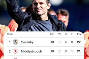 蘭帕德執(zhí)教考文垂本輪擊敗布萊克本,賽季10場不敗高居英冠榜首