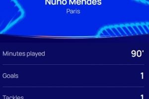 本場比賽努諾-門德斯發(fā)揮出色,傳射建功,7次搶回球權(quán),跑動距離9.6km,賽后他也當選歐冠官方評選出的本場最佳球員。