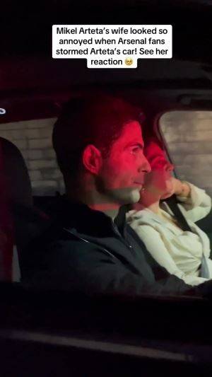 成固定景點(diǎn)了??阿爾特塔駕車被球迷堵住,妻子翻白眼無奈扶額