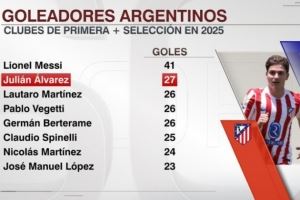 進(jìn)入2025年,阿爾瓦雷斯在俱樂(lè)部和國(guó)家隊(duì)已打進(jìn)27球,阿根廷球員中僅次于梅西的41球。在阿爾瓦雷斯身后是勞塔羅(26球)、維格蒂(26球)、貝爾泰拉梅(26球)、斯皮內(nèi)利(25球)、尼古拉斯-馬丁內(nèi)斯(24球)以及何塞-洛佩斯(23球)。