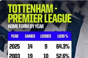 14戰(zhàn)9負(fù)!熱刺今年聯(lián)賽主場(chǎng)落敗率64.3%,創(chuàng)造隊(duì)史英超最差紀(jì)錄