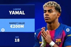 德轉(zhuǎn)列16-25歲各年齡最高身價(jià):亞馬爾2億,貝林、哈蘭德均1.8億