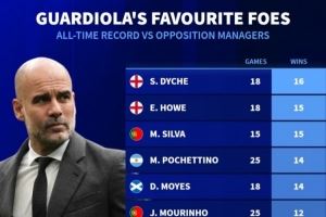 瓜帥執(zhí)教生涯對(duì)陣教練的勝場(chǎng)最多榜