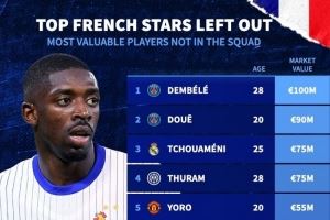 無(wú)緣本期法國(guó)隊(duì)球員身價(jià):登貝萊1億歐最高,杜埃、瓊阿梅尼前三