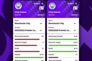 體育資訊11月18日訊 Squawka統(tǒng)計了哈蘭德22-23賽季(英超36球創(chuàng)紀錄)和本賽季的數據,并做出對比。