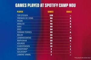 在當前陣容中,五位隊長中的四位占據(jù)了隊內(nèi)諾坎普球場出場次數(shù)榜的前列:特爾施特根、弗蘭基·德容、佩德里和阿勞霍。