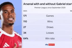 據(jù)天空體育統(tǒng)計(jì),阿森納在沒有加布里埃爾的情況下,勝率下跌多達(dá)24%。