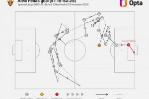數(shù)據(jù)統(tǒng)計(jì)顯示,這粒進(jìn)球經(jīng)歷了22腳傳遞,是本賽季西甲第二多。
