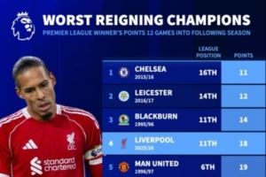 英超衛(wèi)冕冠軍12輪后最低積分:切爾西15年僅11分 利物浦18分列第4