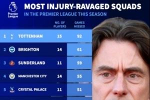 德轉(zhuǎn)本賽季英超傷病榜:熱刺15人受傷+累計(jì)缺席92場(chǎng)排在第一