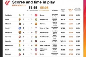 西甲第13輪凈時(shí)間:埃爾切vs皇馬58分8秒,巴薩vs畢巴53分44秒