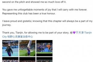 今日阿代米更新個人微博,向天津球迷告別。他寫道: