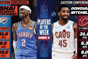 體育資訊11月25日訊 今日NBA官方宣布,亞歷山大和米切爾分別當(dāng)選25-26賽季第5周西部和東部周最佳球員。