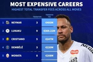 球員生涯總轉(zhuǎn)會費排名:內(nèi)馬爾4億歐居首,盧卡庫、C羅二三位