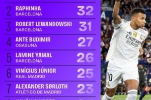 上賽季以來西甲直接參與進(jìn)球數(shù)排行:姆巴佩42球居首大幅領(lǐng)先