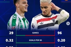 安東尼效力貝蒂斯每90分鐘進0.32球、助攻0.23次,均高于曼聯(lián)時期
