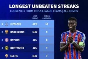 格拉斯納有能!五大聯(lián)賽當(dāng)前不敗榜:水晶宮18場最多,巴薩9場第2