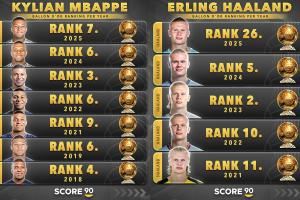 姆巴佩/哈蘭德歷年金球獎排名對比: