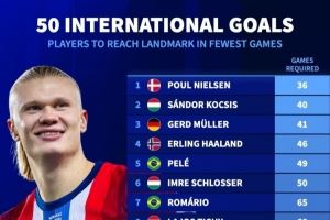 國家隊最快達50球所用場次:哈蘭德46場第4、梅西107場和C羅114場