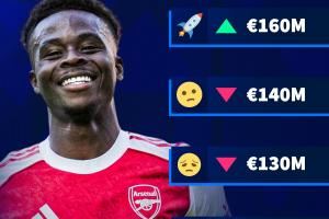 漲還是跌?德轉(zhuǎn)預(yù)熱薩卡身價(jià)變動(dòng):最低1.2億歐??最高1.6億??