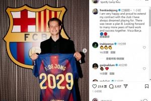 體育資訊10月16日訊 巴薩官方宣布,隊(duì)內(nèi)中場德容續(xù)約至2029年,德容社媒發(fā)文慶祝。