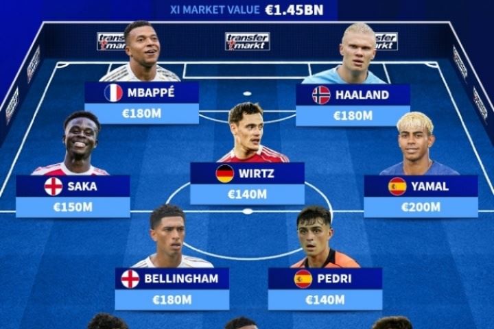 體育資訊10月16日訊 德轉(zhuǎn)盤點了歐足聯(lián)球員的最高身價陣容,整套陣容總價值高達14.5億歐元。其中巴薩小將亞馬爾以2億歐元成為身價最高的球員,姆巴佩、哈蘭德和貝林厄姆均以1.8億歐元并列第二。