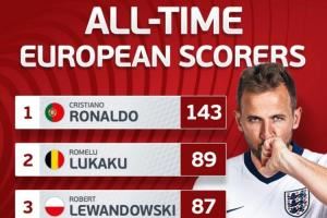 ?? 歐洲國家隊歷史射手榜:凱恩76球進前5名,盧卡庫萊萬排二三
