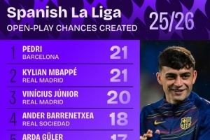 西甲本賽季運(yùn)動戰(zhàn)創(chuàng)造機(jī)會榜:佩德里、姆巴佩21次并列第一