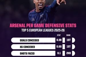 數(shù)據(jù)統(tǒng)計顯示,阿森納本賽季5項防守端關鍵數(shù)據(jù)均位列英超前二: