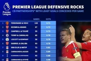 體育資訊10月24日訊 《轉(zhuǎn)會市場網(wǎng)》統(tǒng)計了英超歷史場均丟球數(shù)最少的20組中后衛(wèi)搭檔,該榜單只統(tǒng)計合作了50場以上的中后衛(wèi)搭檔。