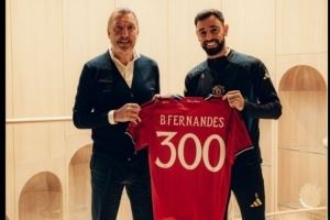 曼聯(lián)官推也曬出了B費(fèi)被贈(zèng)送印有300字樣的紀(jì)念球衣的照片,并配文:“B費(fèi)將在周六迎來(lái)他在曼聯(lián)的第300場(chǎng)比賽?!?/p>