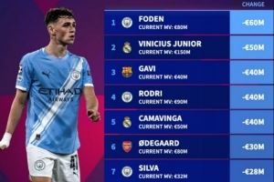 2025年身價跌幅榜:福登-6000萬歐居首,維尼修斯-5000萬歐次席