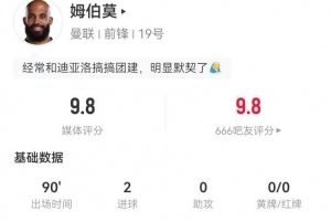 姆伯莫本場3射3正進2球+1失良機 5過人4成功 9對抗6成功 獲9.8分