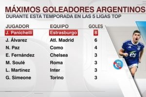 體育資訊10月27日訊 ESPN統(tǒng)計(jì)了阿根廷球員在本賽季五大聯(lián)賽中的進(jìn)球數(shù)量,并列出五大聯(lián)賽阿根廷球員射手榜,斯特拉斯堡大中鋒帕尼切利8球居首。