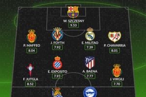 后衛(wèi):馬菲奧(馬洛卡,8.04分)、福伊特(比利亞雷亞爾,7.92分)、米利唐(皇家馬德里,7.39分)、佩普-查瓦利亞(巴列卡諾,8.01分)