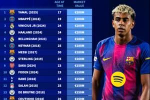 體育資訊10月29日訊 德轉(zhuǎn)盤點(diǎn)了歷史上身價(jià)最高的30名球員,歷史上共有四名球員達(dá)到過(guò)2億歐元里程碑,分別是亞馬爾(2025年,17歲)、姆巴佩(2018年,19歲)、維尼修斯(2024年,24歲)和哈蘭德(2024年,24歲)。