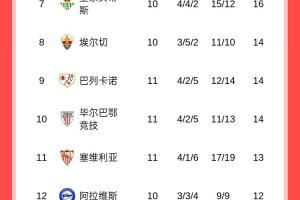 西甲積分榜:皇馬11輪10勝暫7分優(yōu)勢(shì)領(lǐng)跑,巴薩第三明日出戰(zhàn)