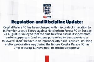 體育資訊11月5日訊 英足總發(fā)布官方公告,確認水晶宮俱樂部因球迷行為不當遭到指控,需要在11月11日之前做出回應。