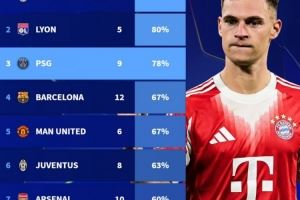 拜仁近20個(gè)賽季歐冠對(duì)巴黎勝率78%,至少對(duì)陣5次球隊(duì)中勝率第3