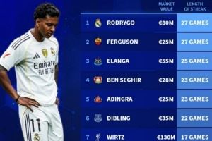 德轉(zhuǎn)盤點目前遭遇進球荒攻擊手:羅德里戈27場居首,維爾茨17場
