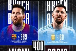 里程碑!梅西生涯400助分布:巴薩269+阿根廷60+邁阿密37+巴黎34