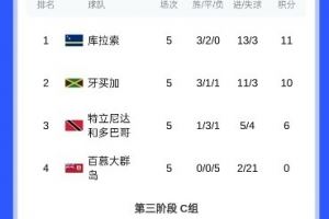 B組第五輪,特立尼達(dá)多巴哥1-1牙買加、庫拉索7-0百慕大群島,庫拉索11分、牙買加10分前二,兩隊(duì)末輪正面交手爭奪直通資格。