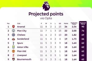 體育資訊11月15日訊 本賽季英超已經(jīng)過(guò)去11輪,阿森納8勝2平1負(fù),積26分排名聯(lián)賽第1,領(lǐng)先第二的曼城4分。